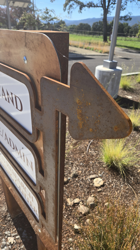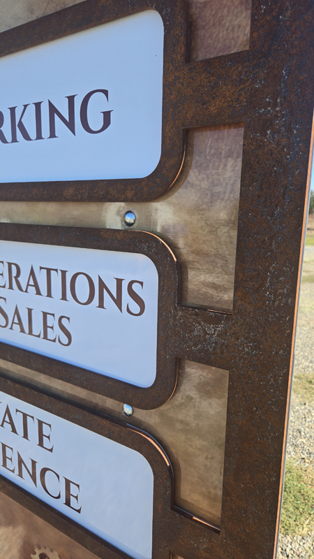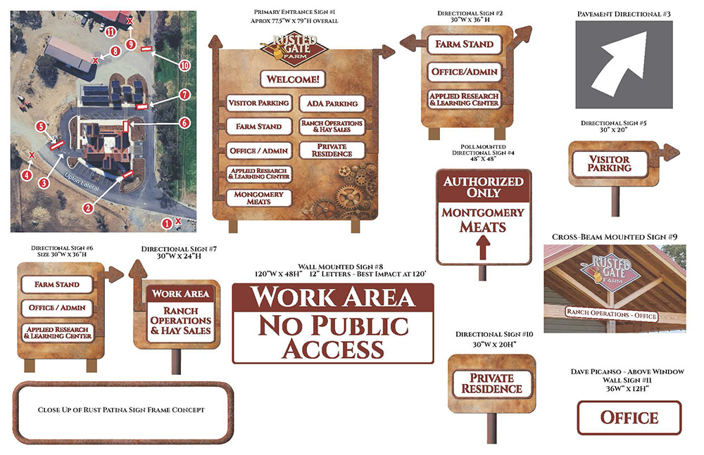Working with a talented local sign company, The Sign Dude, the graphic elements of the signs came to life using a patina of rusted steel and high resolution printed vinyl on an aluminum substrate. These signs were built to last many years, and blend in perfectly with our client's rural property.